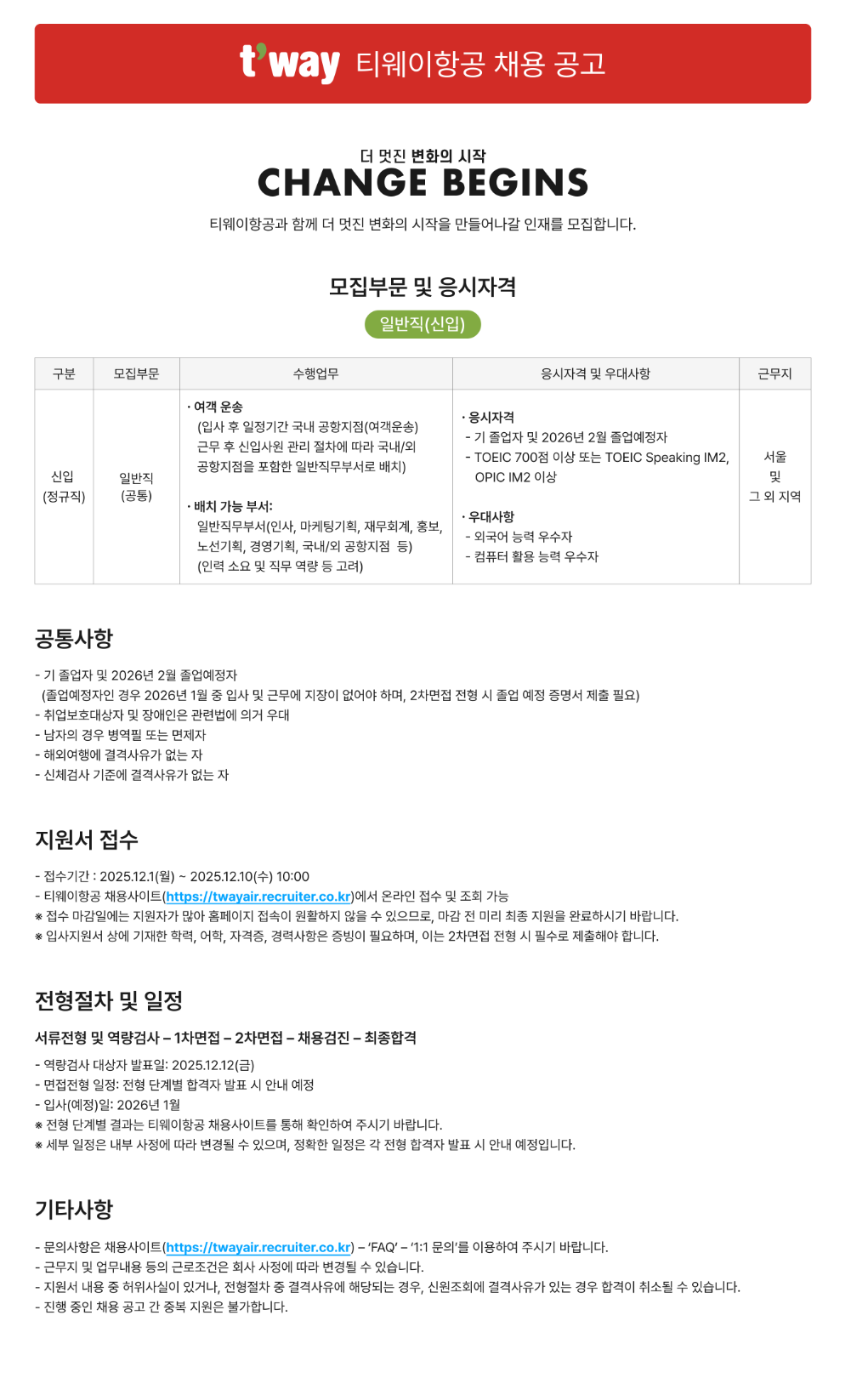 취업게시판 HOME 취업&진로 취업게시판 프린트 취업게시판 상세보기, 제목, 내용, 파일, 작성자등의 정보를 제공합니다. 제목 [티웨이항공] 일반직(신입) 채용 (~12/10) 사진 확대보기 png 파일 참조 파일 [티웨이항공] 일반직(신입) 채용 .png 작성자 박해원 (영어영문학과) 목록 이전글 [우리은행] 2026년 동계 체험형 인턴 채용 (~12/15) 다음글 [주택도시보증공사] 2026년 상반기 체험형 청년인턴 채용 (~12/11)