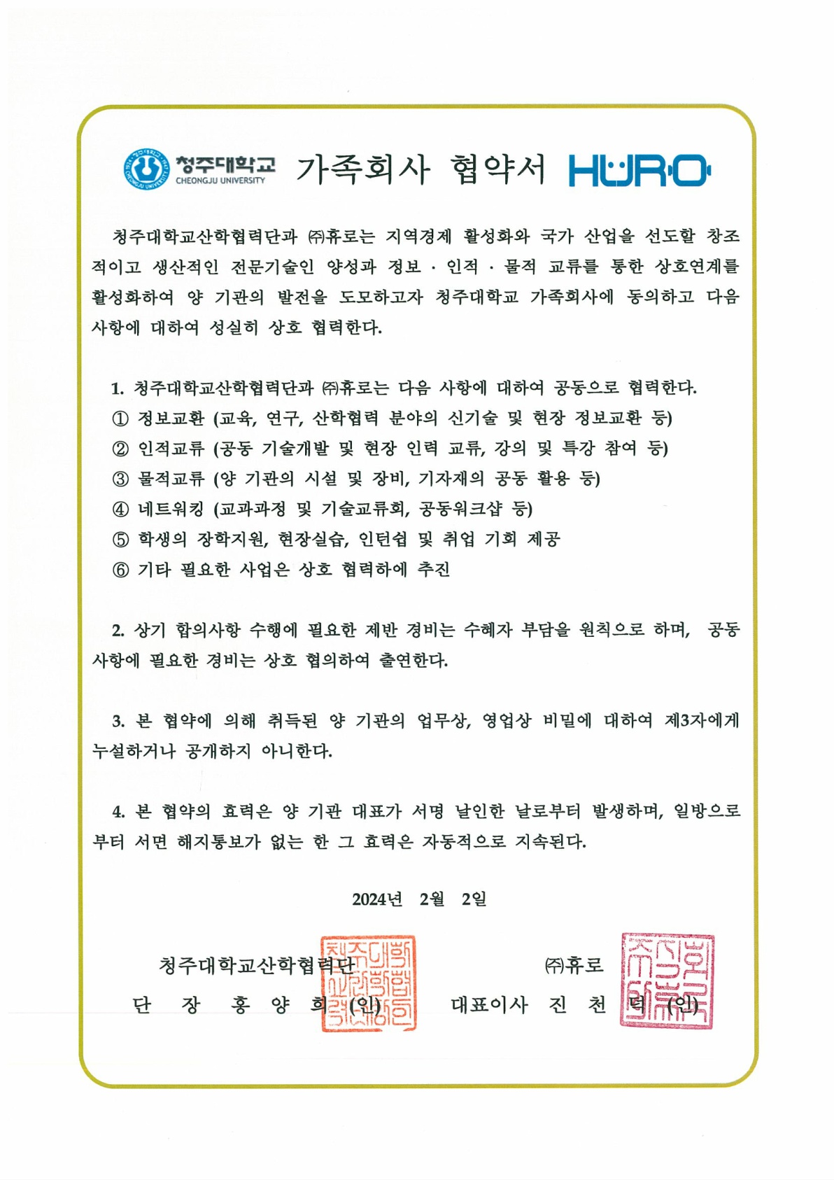 가족회사 홈 성과관리 가족회사 프린트 가족회사 상세보기 - , 제목, 내용, 파일등의 정보를 제공합니다. 제목 (주)휴로 사진 확대보기 (주)휴로 파일 20240202_차형우 교수_가족회사 협약서_(주)휴로_1.jpg 20240202_차형우 교수_가족회사 협약서_(주)휴로.pdf 목록 이전글 동원건설(주) 다음글 우진산전
