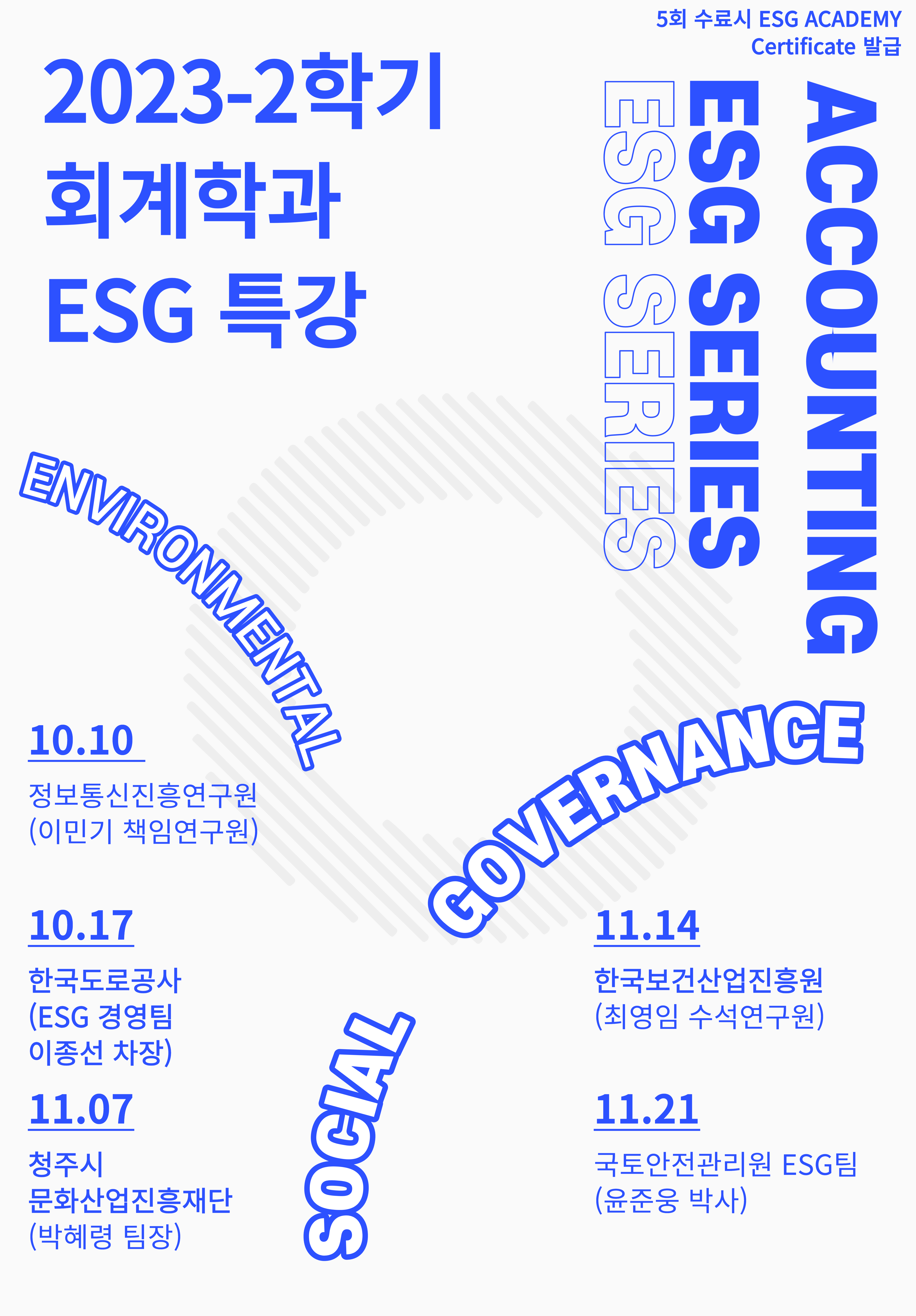 공지사항 HOME 학과게시판 공지사항 프린트 공지사항 상세보기, 제목, 내용, 파일, 작성자등의 정보를 제공합니다. 제목 2023-2학기 회계학과 ESG특강 일정 사진 확대보기 파일 ESG포스터(2학기).png 작성자 회계학과 목록 이전글 2023학년도 2학기 회계학과 졸업시험 시행 다음글 ESG특강 수료 안내