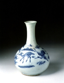 口部가 약간 벌어져 말리고 길게 솟은 목에 어깨로부터 벌어져 풍만해진 동체를 이루었으며, 낮고 넓은 굽을 지니고 있는 병이다. 문양은 靑華顔料를 사용하여 굽다리에 1조의 가는 선대를 돌렸고 그 위에 역시 진한 청화안료로 十長生무늬를 통체에 가득하게 시문하였다. 목 이상의 부분은 수리되었다. 유약은 푸른 빛이 약간 감도는 맑고 투명한 白磁釉가 전면에 고르게 시유되었으며 광택이 매우 양호하다.