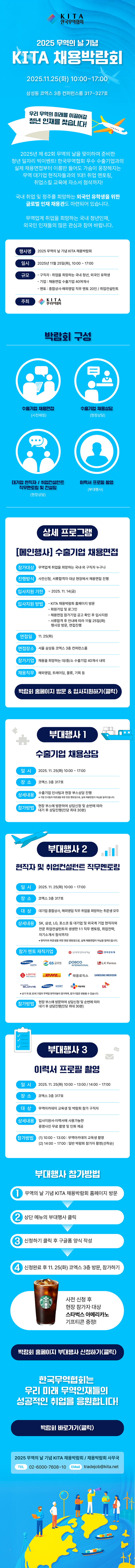| 제목 | 2025 무역의 날 기념 KITA 채용박람회 참가 구직자 모집 (11월 16일까지 입사지원) |