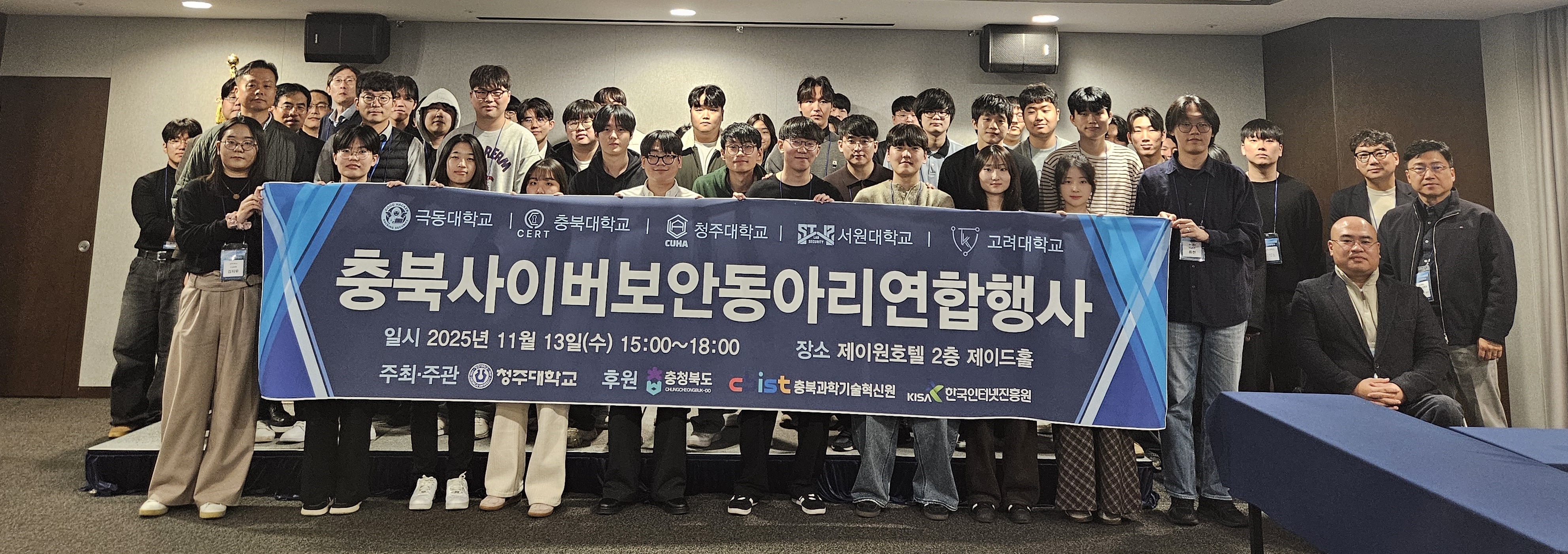 [ 청주대, ‘충북 사이버보안 동아리 연합 행사’ 개최 ] 지역내 대학 교류 활성화 및 협력 네트워크 구축 청주대학교(총장 김윤배)는 최근 지역 내 대학 사이버보안 동아리 간 교류 활성화와 대학 중심의 협력 네트워크 구축을 위해 ‘2025 충북 사이버보안 동아리 연합 행사’를 오창 제이원호텔에서 개최했다고 13일 밝혔다.