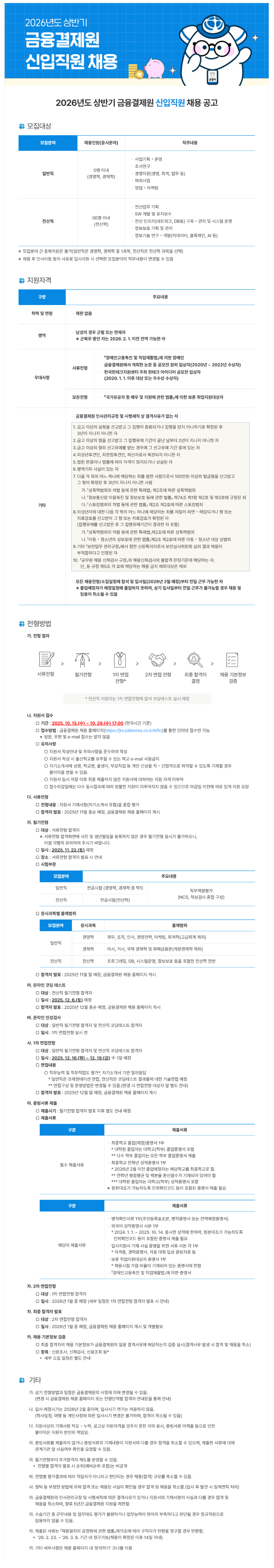 취업게시판 HOME 취업&진로 취업게시판 프린트 취업게시판 상세보기, 제목, 내용, 파일, 작성자등의 정보를 제공합니다. 제목 [금융결제원] 2026년도 상반기 신입직원 채용 (~10/29) 사진 확대보기 png 파일 참조 파일 [금융결제원] 2026년도 상반기 신입직원 채용 .png 작성자 박해원 (영어영문학과) 목록 다음글 [현대백화점그룹] 2025년 하반기 현대백화점그룹 신입사원 채용 (~11/6)