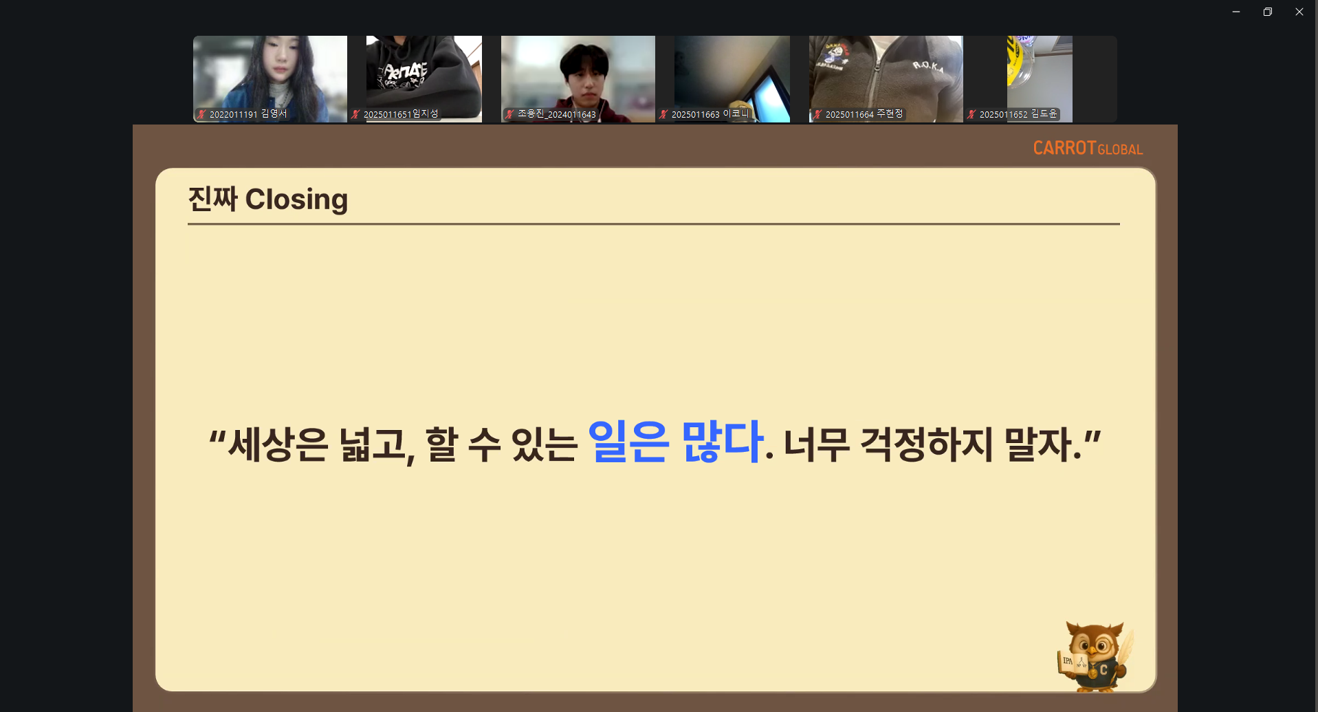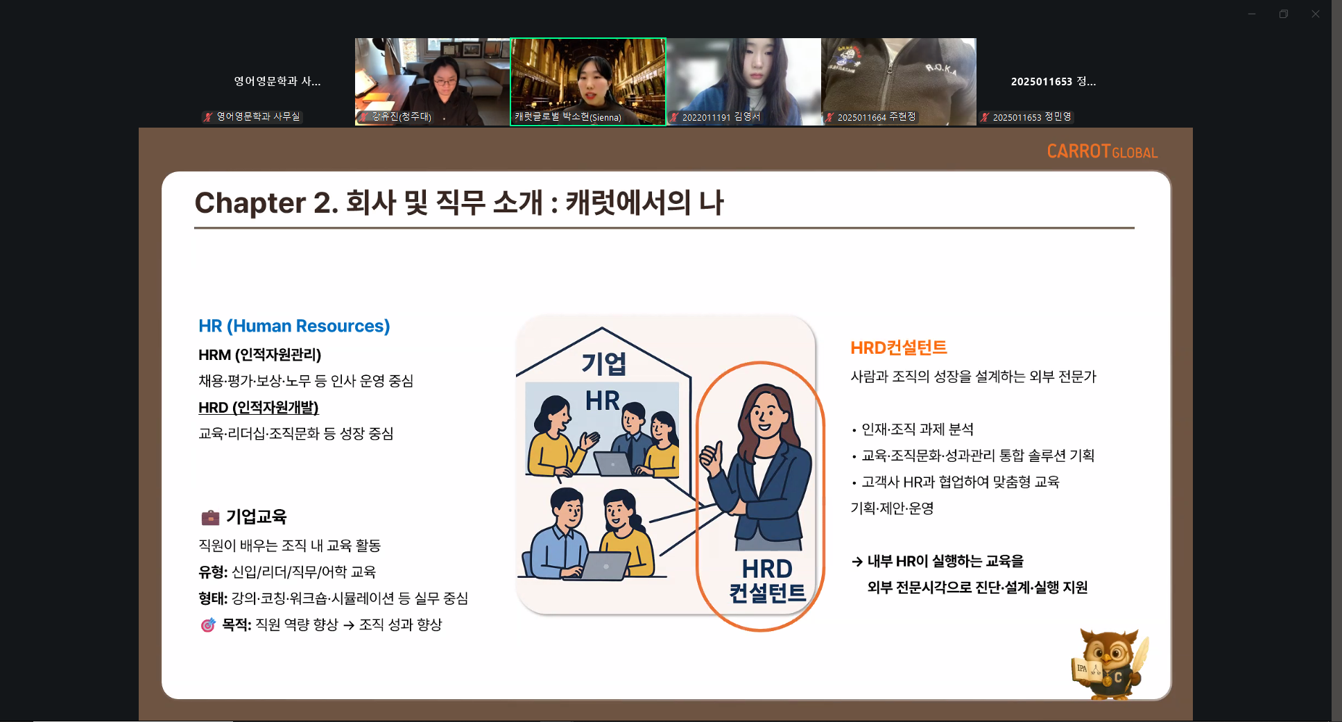 📍 주제: 영어영문학 전공 역량 기반 진로 탐색 및 취업 준비 👥 대상: 영어영문학과 재학생 🤝 연계기관: 캐럿글로벌(Carrot Global) 청주대학교 영어영문학과에서는 글로벌 교육·컨설팅 기업 캐럿글로벌(Carrot Global) 과 함께 전공 기반 진로 탐색을 위한 온라인 특강을 진행했습니다. 이번 특강은 영어영문학을 배경으로 어떤 진로를 설계할 수 있을지 고민하는 학생들에게 실질적인 도움을 드리고자 마련되었습니다. 강의에서는 실제 기업 현장에서 요구하는 역량과 취업을 준비하는 과정에서 참고할 만한 조언들이 공유되었습니다. 전공의 강점을 어떻게 현실적인 진로로 연결할 수 있을지 생각해 볼 수 있는 시간이었습니다. 또한 캐럿글로벌과 우리 학과가 체결한 MOU를 통해 앞으로 제공될 실무 경험 기회, 인턴십 연계, 취업 상담 등을 지원할 수 있어 전공을 활용한 진로 확장에 대한 기대가 한층 높아지는 자리였습니다. 이번 특강을 통해 영어영문학 전공이 가진 가능성과 확장성을 다시 한 번 확인할 수 있었으며, 학생들이 스스로의 진로를 구체적으로 그려보는 데 의미 있는 시간이 되었습니다. 청주대학교 영어영문학과는 앞으로도 학생들의 진로와 배움의 폭을 넓힐 수 있는 다양한 비교과 활동을 꾸준히 이어갈 예정입니다. |