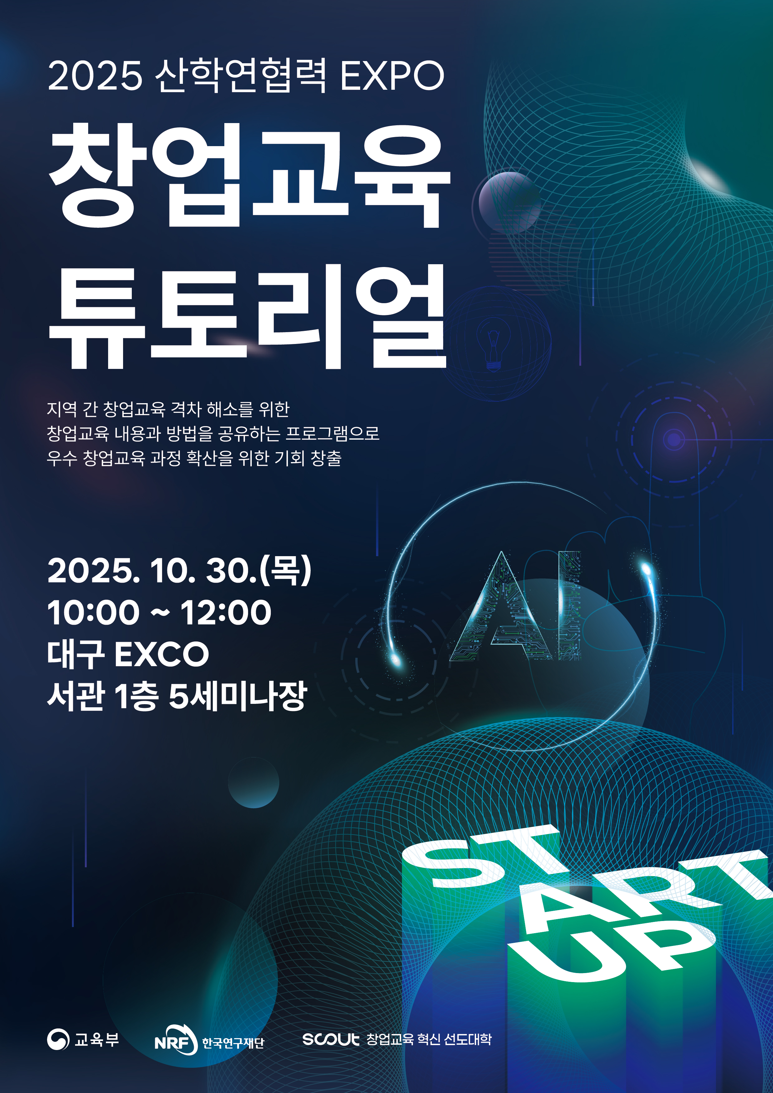 교육부와 한국연구재단이 주최하며 전국 창업교육 혁신 선도대학(SCOUT) 사업단이 주관하는‘2025 산학연협력 EXPO in 창업교육 튜토리얼’세미나 개최하오니 많은 참석하여 주시기 바랍니다.