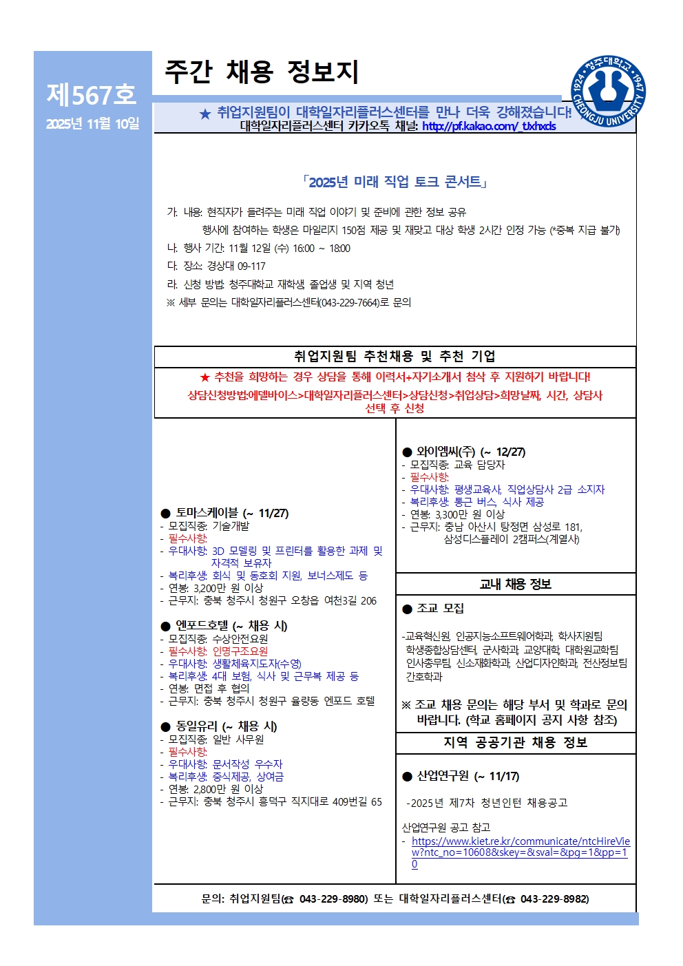 ☏ 추천채용 관련 문의: 043) 229-8734 (대학일자리플러스센터)