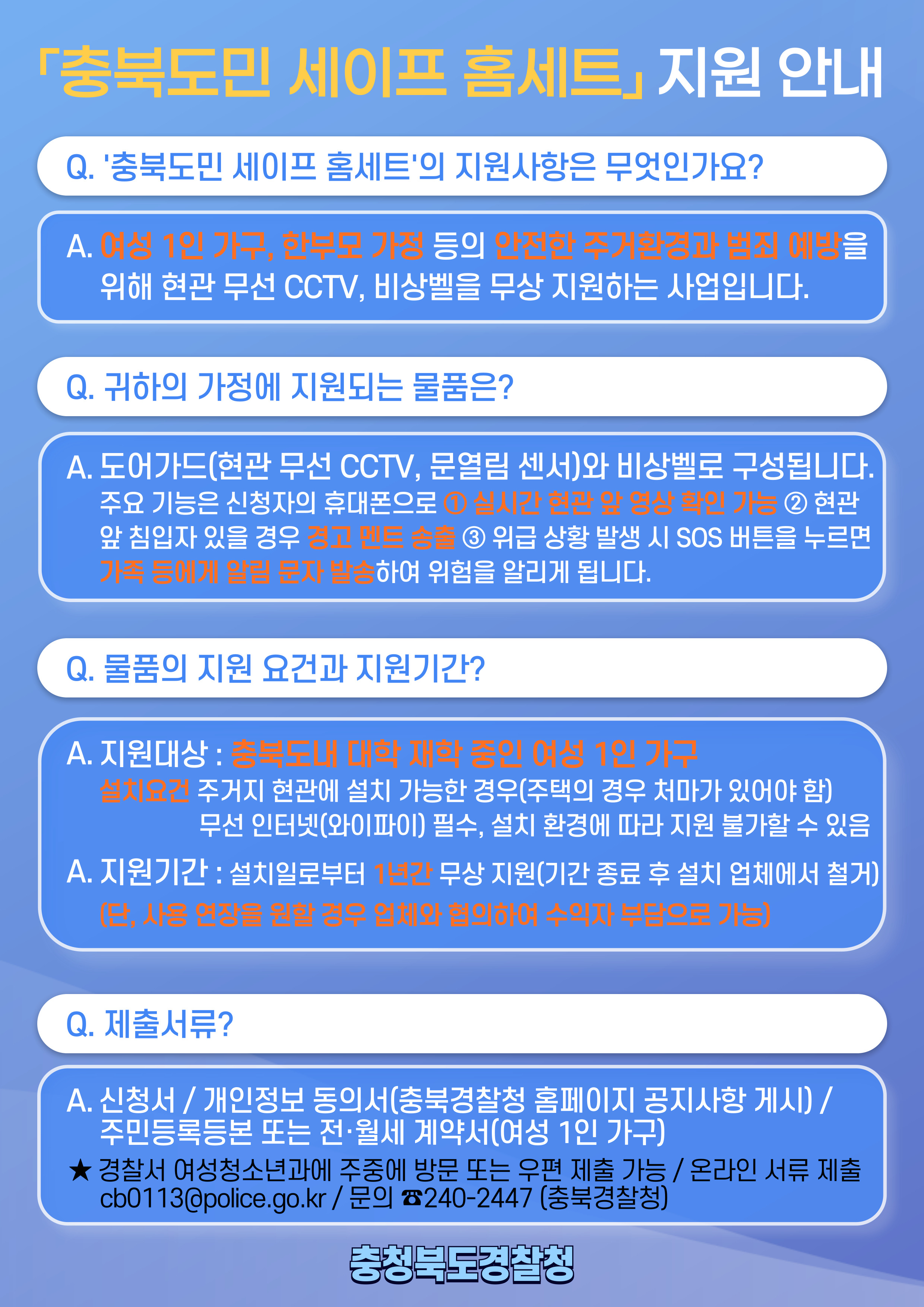 (지원대상) 원룸, 오피스텔 등에 혼자 거주하는 대학생 여성 1인 가구 <접수 선착순 마감> (지원물품) 현관 CCTV, 문열림센서, 비상벨 세트 무상 지원 (지원기간) 1년간(설치되는 물품은 렌탈 물품으로 1년간 사용 후 업체에서 철거함) (제출방법) 경찰서 여성청소년과 방문·우편 접수 또는 충북경찰청 이메일로 서류 제출 해당 지원 사업에 대한 자세한 안내는 아래 파일 확인바랍니다. |