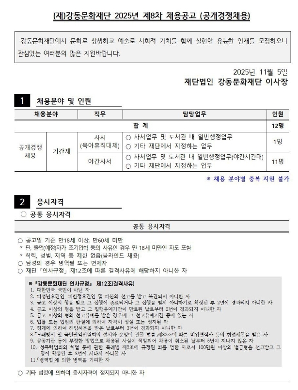 1. 채용인원 가. 사서- 육아휴직대체 (1명) 나. 사서- 야간사서 (11명) 2. 응시자격요건 준사서 이상 자격 소지자 3. 원서 접수 기간 2025. 11. 19.(수) ~ 11.25(화) 마감일 17시까지 4. 근무기간 육아휴직대체 사서: 2027. 4. 28.까지 야간사서: 임용일로부터 1년간 |