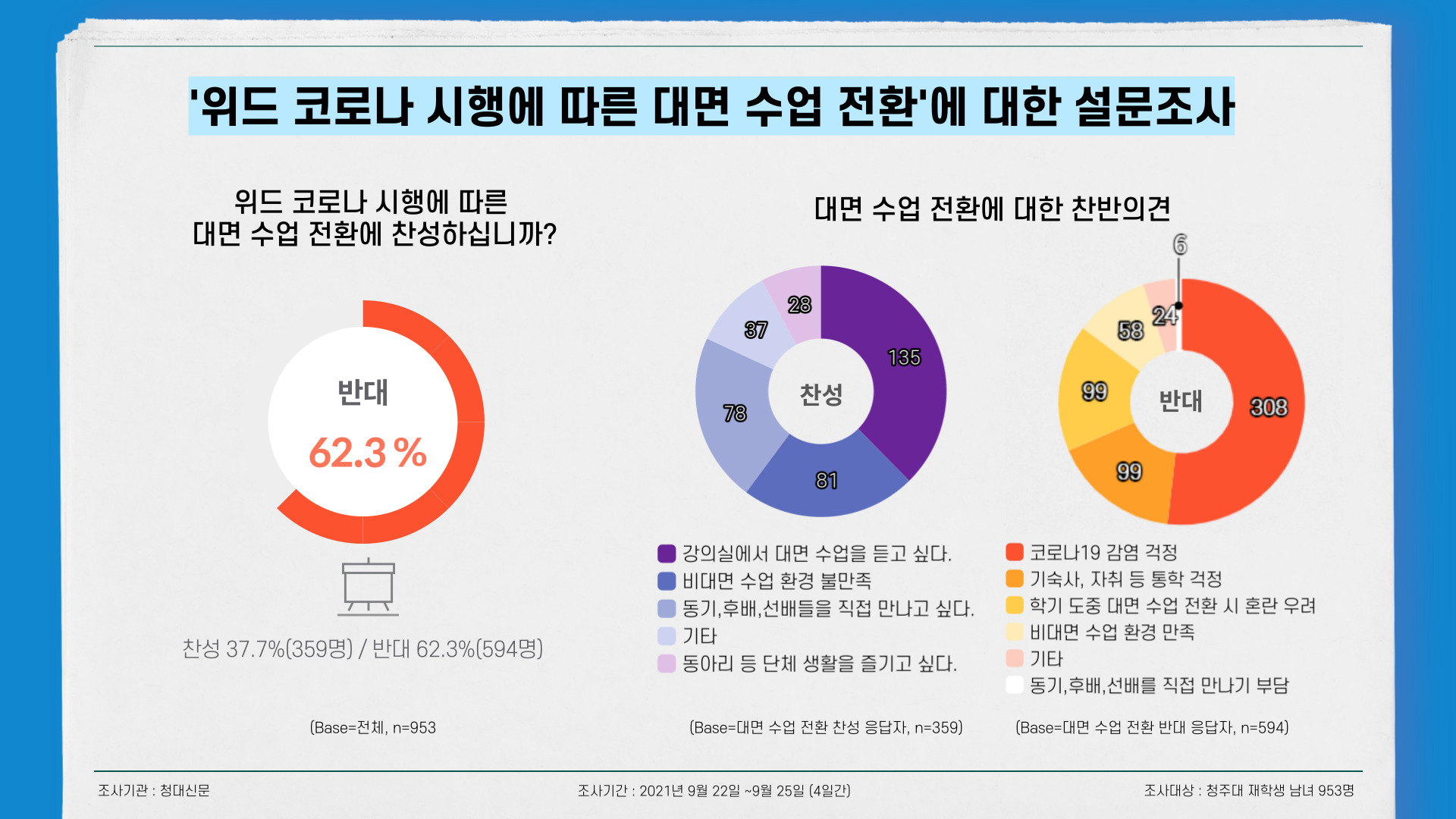 청대신문에서 ‘위드 코로나 시행에 따른 대면 수업 실시’에 대한 학우들의 의견을 묻고자 지난달 22일부터 25일까지 우리대학 학우들을 대상으로 설문조사를 진행했다. 총 953명의 학우가 응답했다. 그 결과, 응답자의 37.7%(359명)는 대면 수업 전환에 찬성했고 62.3%(594명)는 대면 수업 전환에 반대했다.