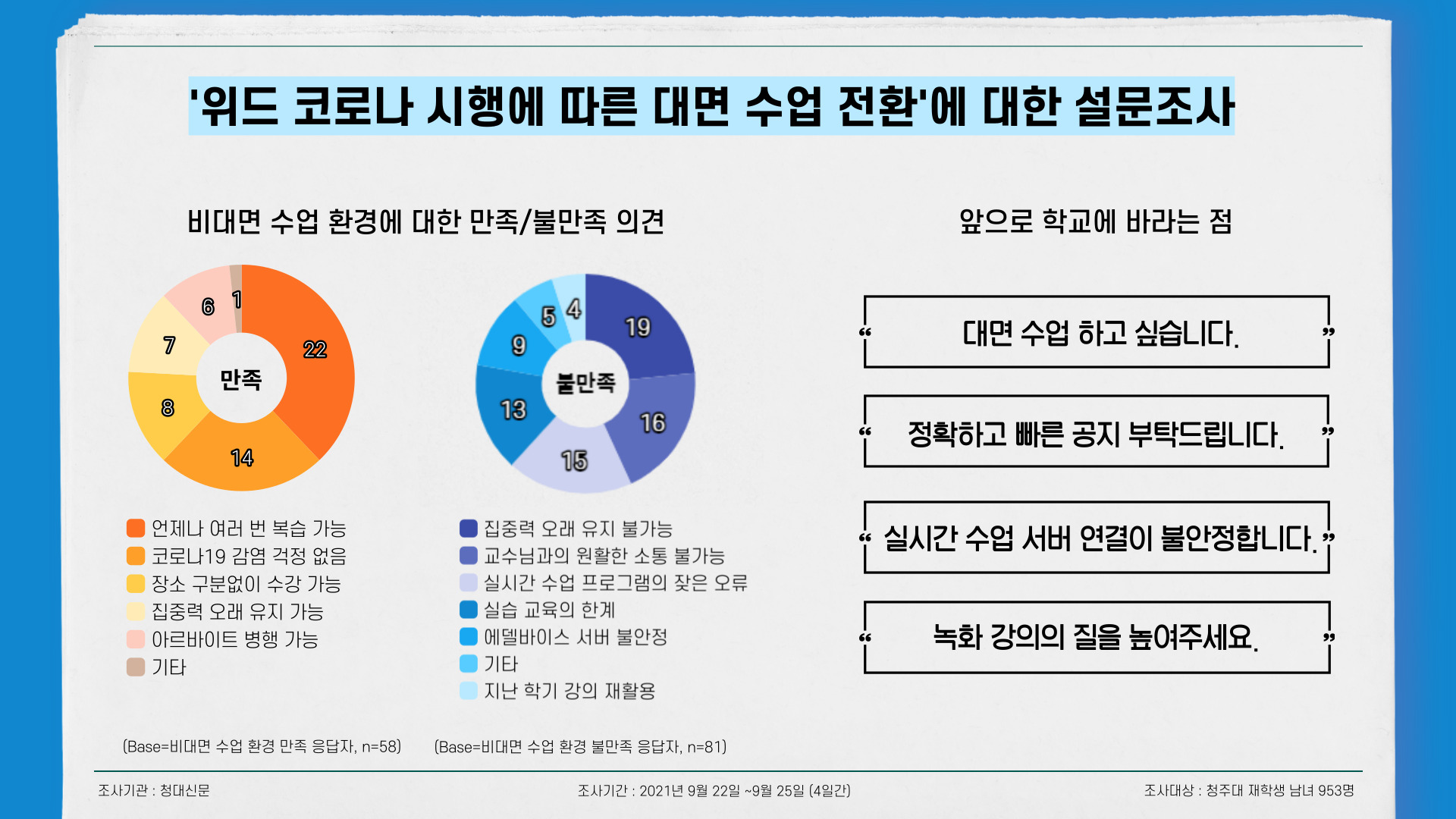 ![]() ▲ 우리대학 재학생 953명이 참여한 설문조사다. 비대면 수업환경에 대한 의견과 앞으로 학우들이 우리대학에 바라는 내용이다. / 인포그래픽=맹찬호 기자