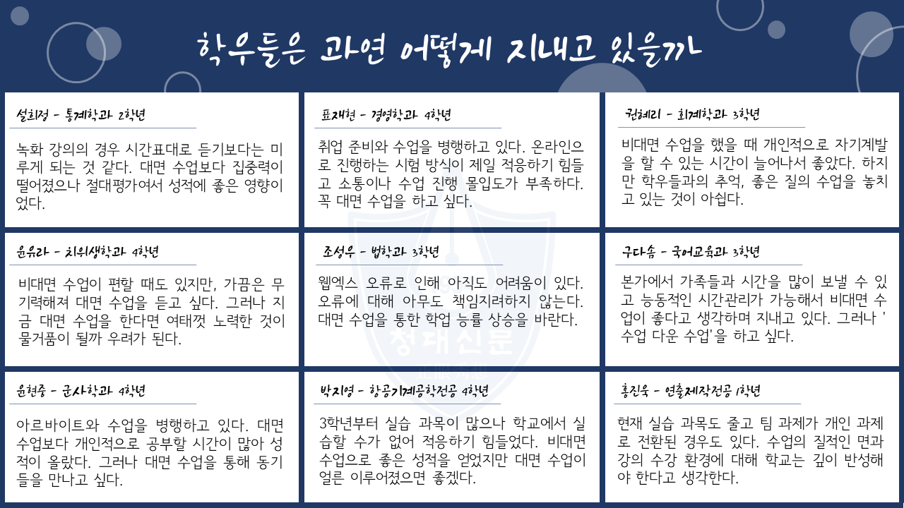 | 제목 | 【기획】 코로나19 속 뛰어다닐 수 있나 - 재학생 62.3%, 대면 수업 전환 반대 |