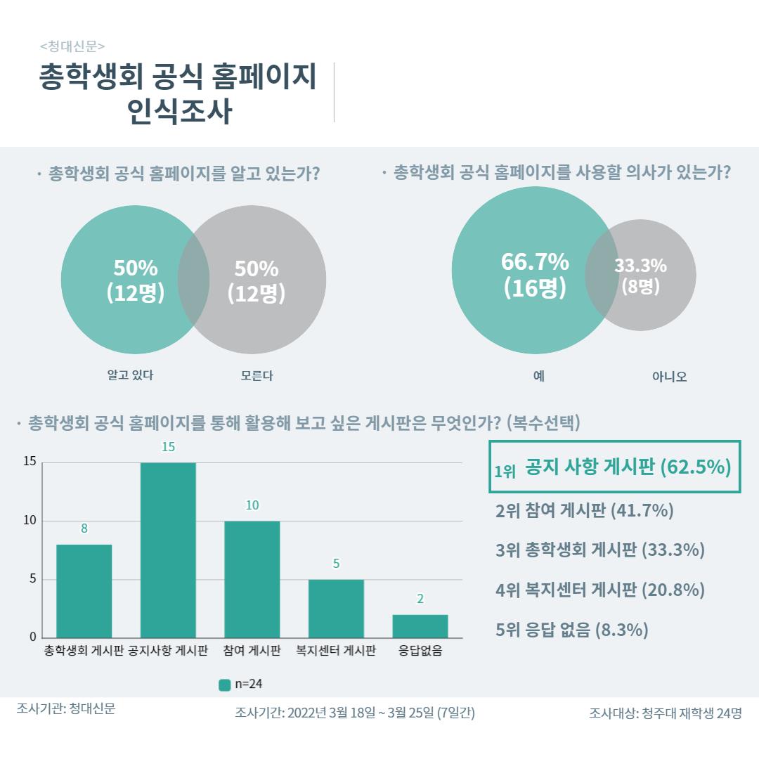 우리대학 학우들을 대상으로 총학생회 홈페이지에 대한 인식을 알아보기 위해 지난달 18일부터 25일까지 설문조사를 진행했고, 총 24명의 학우가 응답했다. 그 결과, 응답자의 50%(12명)가 총학생회 홈페이지를 ‘알고 있다’, 50%(12명)가 ‘모른다’고 답했다. 또한, ‘총학생회 공식 홈페이지를 사용할 의사가 있나요?’라는 질문에 66.7%(16명)가 ‘예’, 33.3%(8명)가 ‘아니오’라고 답했다.