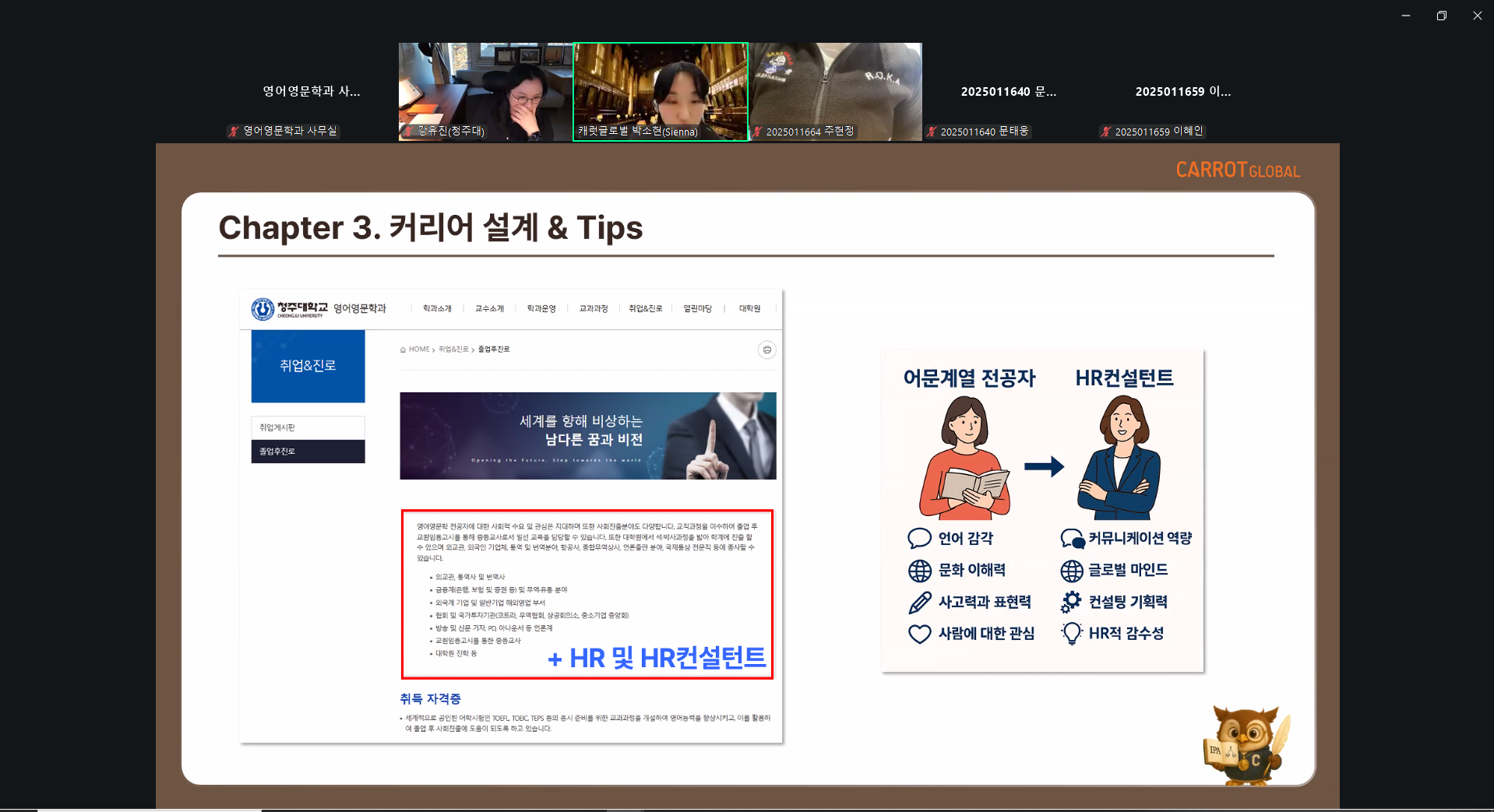 📍 주제: 영어영문학 전공 역량 기반 진로 탐색 및 취업 준비 👥 대상: 영어영문학과 재학생 🤝 연계기관: 캐럿글로벌(Carrot Global) 청주대학교 영어영문학과에서는 글로벌 교육·컨설팅 기업 캐럿글로벌(Carrot Global) 과 함께 전공 기반 진로 탐색을 위한 온라인 특강을 진행했습니다. 이번 특강은 영어영문학을 배경으로 어떤 진로를 설계할 수 있을지 고민하는 학생들에게 실질적인 도움을 드리고자 마련되었습니다. 강의에서는 실제 기업 현장에서 요구하는 역량과 취업을 준비하는 과정에서 참고할 만한 조언들이 공유되었습니다. 전공의 강점을 어떻게 현실적인 진로로 연결할 수 있을지 생각해 볼 수 있는 시간이었습니다. 또한 캐럿글로벌과 우리 학과가 체결한 MOU를 통해 앞으로 제공될 실무 경험 기회, 인턴십 연계, 취업 상담 등을 지원할 수 있어 전공을 활용한 진로 확장에 대한 기대가 한층 높아지는 자리였습니다. 이번 특강을 통해 영어영문학 전공이 가진 가능성과 확장성을 다시 한 번 확인할 수 있었으며, 학생들이 스스로의 진로를 구체적으로 그려보는 데 의미 있는 시간이 되었습니다. 청주대학교 영어영문학과는 앞으로도 학생들의 진로와 배움의 폭을 넓힐 수 있는 다양한 비교과 활동을 꾸준히 이어갈 예정입니다. |