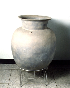 사립이 섞인 정선된 태토로 고온 소성하였으며 색조는 회청색을 띠고 있다. 長卵形의 큰 동체부와 크게 벌어진 목을 가진 거대한 항아리이다. 전체적으로 많이 수리되었으며 출토지는 미상이다. 뾰족한 밑에서 벌어져 올라가 배부분에서 최대 지름을 이루었으며 동체부 상단에서는 다시 급격히 좁아져 어깨를 이루었는데 어개 양쪽에 돌기형의 꼭지가 장식되었다. 어개에서 직각으로 꺽이어 올라가면서 점차 벌어지다가 구연에서는 완전히 외반되어 전을 형성하였다, 전체적으로 문양은 전혀 시문되지 않았고 밑면의 일부가 일그러져 있다.