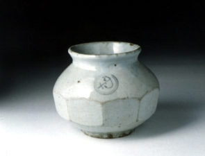 넓은 口部와 팽창된 동체부 그리고 낮은 굽다리로 이루어진 항아리이다. 짧은 목에서 구연부가 외반되어 올라가고 어깨로부터 벌어져 내려가다 동체으 중간에서는 8각을 이루었으며 다시 급히 좁혀져 내려가 굽다리에 연결되었다. 전체적으로 기벽이 두꺼워 무겁게 느껴지며 굽에는 모래받침의 흔적이 남아 있다. 문양은 어깨부분에만 2중의 圓圈紋 안에 梵字무늬를 시문하였을 뿐으로 단순 소박하다. 유약은 담청색이 감도는 백자유로 전면에 걸쳐 두껍게 시유되었으며 광택이 있으나 지금은 마모되어 불투명해졌다.