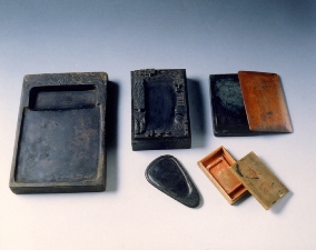 먹을 가는데 쓰는 돌로 만든 문방구이다. 벼루를 만드는 돌은 너무 딱딱해도 않되고 너무 물러도 좋지 않은데 이 벼루는 색상이 거의 자색을 띠며 윤기가 흐르는 端溪硯으로 추정된다. 돌을 장방형의 판으로 다듬고 연마하여 먹이 갈리는 내부를 파내었는데 상단부를 더욱 깊게 파서 먹물이 고이도록 하였다. 둘레에는 테두리를 두었는데 상단부쪽은 폭을 좀더 넓게하여 수초를 사이에 두고 물고기 두 마리가 마주보고 있는 모습을 양각으로 조각하였다. 붉은 물감을 이용하여 글씨를 쓰거나 부적과 같은 그림을 그릴 때 사용되었던 소형의 벼루이다. 벼루는 아무 문양장식이 없는 장방형으로 벼루집 뚜껑에 붉은 글씨로 “朱硯”이라 쓰여 있다. 간단한 글을 쓰거나 여행사에서 휴대용으로 사용되었을 듯 한 작은 벼루이다. 각을 죽여 둥글게 처리한 긴 삼각형 모양으로 매우 얇고 장식은 전혀 없다. 벼루는 종이, 붓, 먹과 더불어 文房四友라 칭해질 정도로 선비들에게 친근하고 꼭 필요한 문방구였다. 또한 벼루는 수명이 길어 家寶로 대물림하여 사용하였으며 왕이 신하에게 하사품으로 내리기도 하였다. 사진의 왼쪽은 草花무늬가 화려하게 장식된 먹이며 가운데 벼루는 장방형의 평범한 벼루로서 특별한 장식이 없다. 오른쪽 벼루는 가장자리를 온통 초화무늬와 산수무늬로 장식하여 중앙의 내부가 마치 호수와 같은 모양을 나타내었다. |