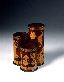 높고 낮은 대통 3개를 서로 붙여 변화롭게 구성하여 만든 필통이다. 각 대통의 표면의 것대에 십장색 무늬를 서로 연속되게 조각하여 화려하게 장식하였다. 그리고 각통의 상단에는 雷紋帶를 돌렸고 하단에는 立狀形의 運瓣紋帶를 돌려 마무리하였다. 밑은 판목을 3개의 대통에 맞게 오려 붙여 바닥으로 삼았다.