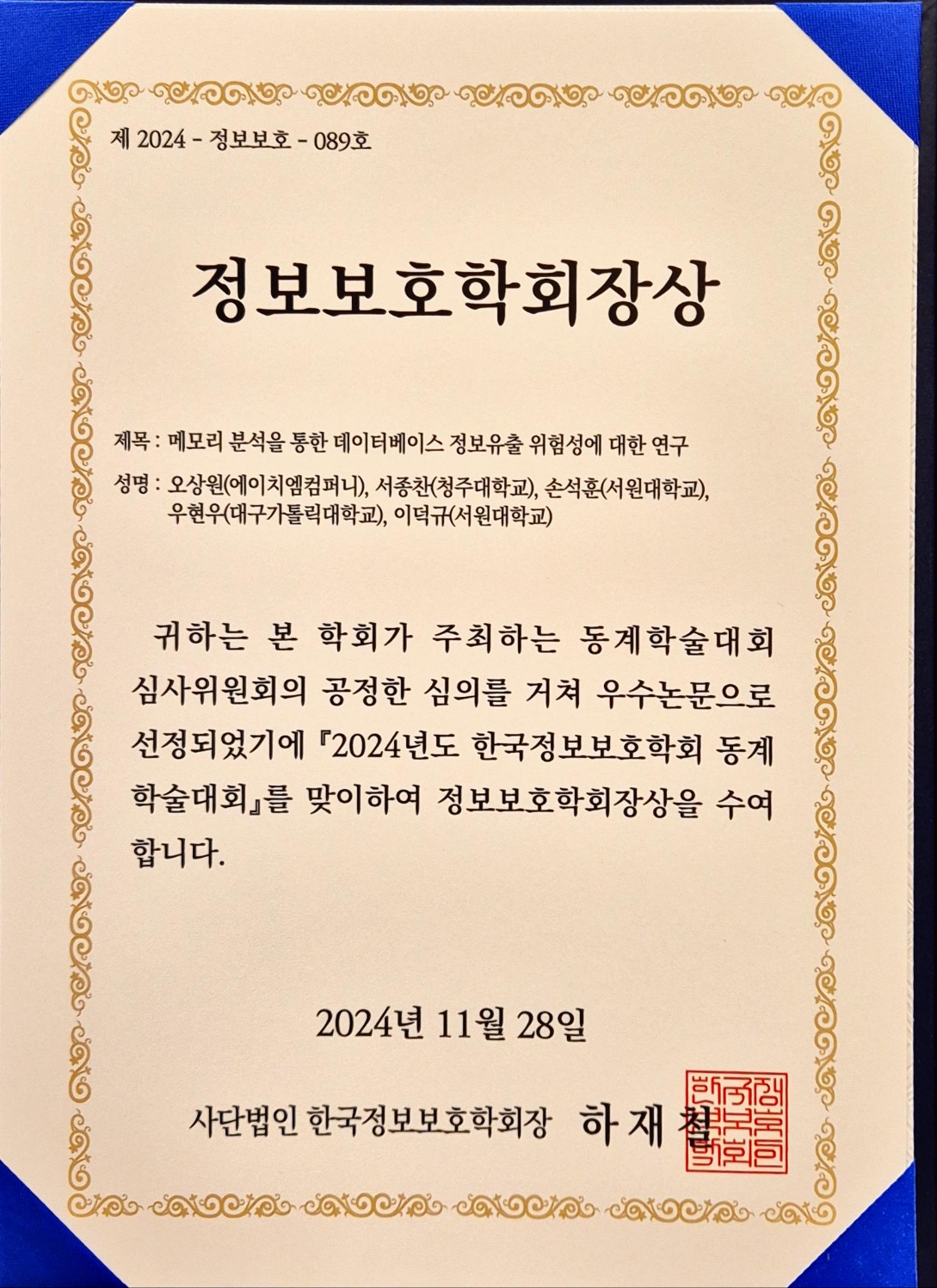 학과소식 HOME 열린마당 학과소식 프린트 학과소식 상세보기, 제목, 내용, 파일등의 정보를 제공합니다. 제목 서종찬 학생, 2024년도 한국정보보호학회 동계학술대회 우수논문상(한국정보보호학회장상) 사진 확대보기 한국정보보호학회장상 파일 KakaoTalk_20241129_140545906.jpg 목록 이전글 서종찬 학생, 2024 KFDS 챌린지 학생부 대상(경찰청장상) 다음글 정은수 교수, 과학기술정보통신부장관 표창