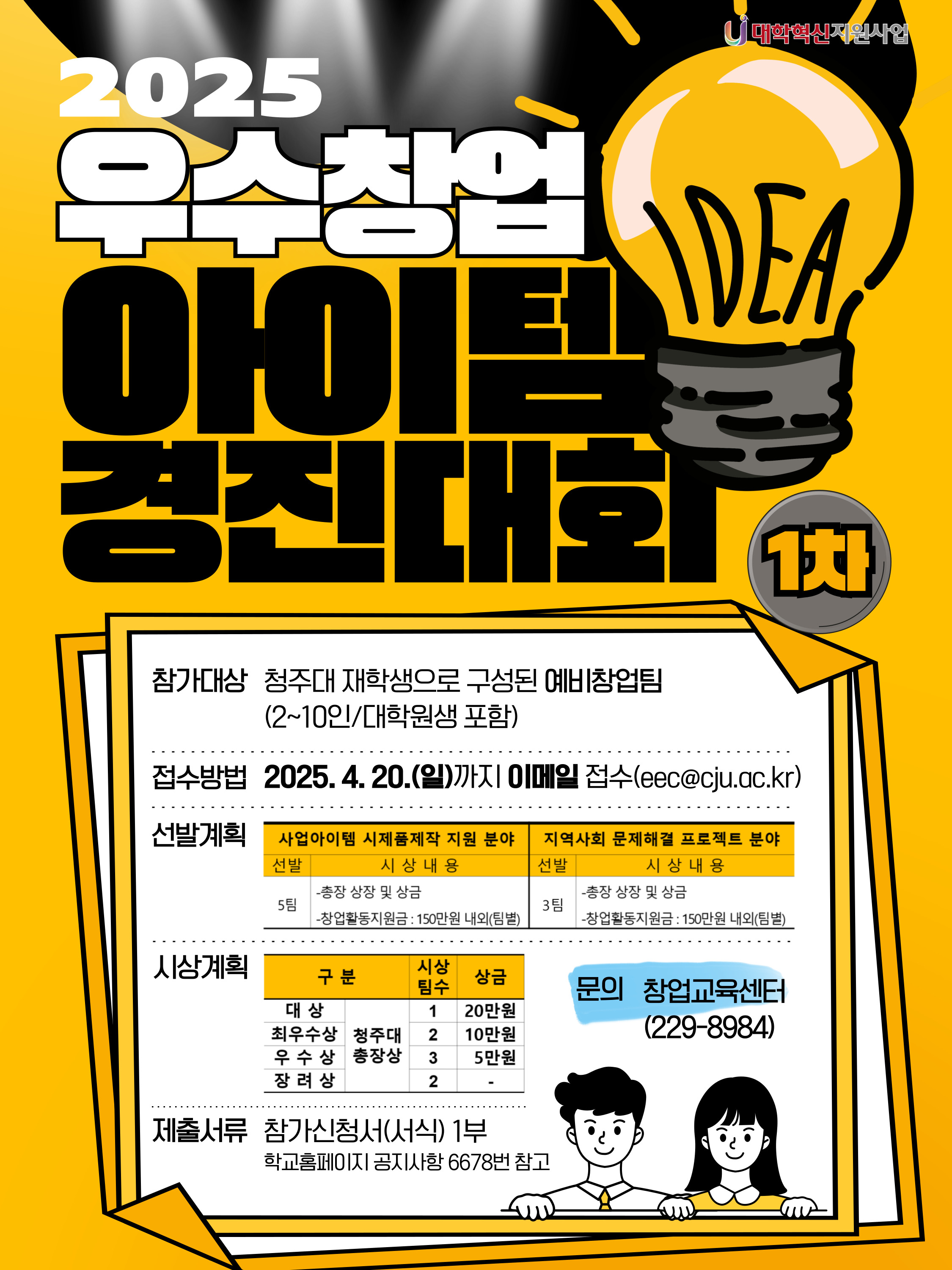 ◦사업아이템 시제품 제작 분야: 5팀 ◦지역사회 문제해결 프로젝트 분야: 3팀 [신청 및 접수] ◦참가자격: 청주대학교 재학생(대학원생 포함) ◦참가대상 -창업아이디어를 가지고 창업활동을 하고 있는 팀 -창업교육센터 창업동아리 등 ◦접수마감: 2025. 4. 20(일) 24:00까지 ◦신청방법: 이메일(eec@cju.ac.kr) 제출 ◦제출서류: 참가신청서 1부 ◦문의전화: 창업교육센터(043-229-8984) [참가자 혜택] ◦역량 마일리지 부여(500점) |