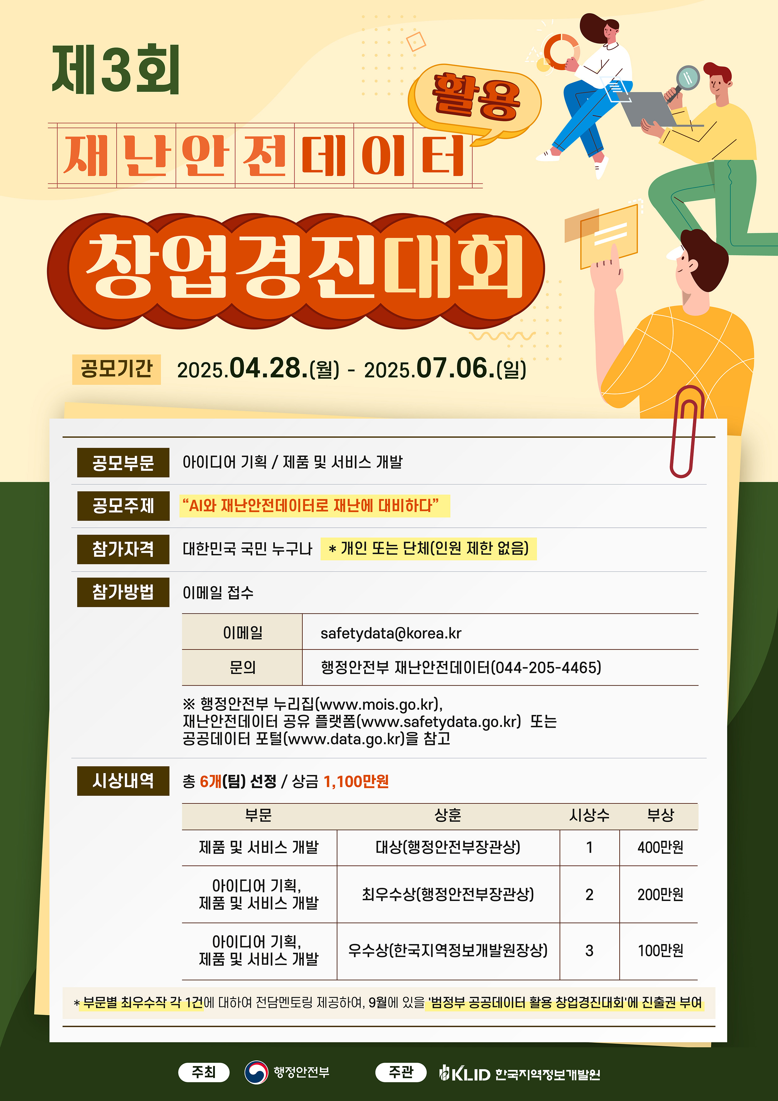 ○ 공무부문: 아이디어 기획 / 제품 및 서비스 개발 ○공모주제: AI와 재난안전데이터로 재난에 대비하다 ○ 참가대상*: 대한민국 국민 누구나 * 개인 또는 단체(인원제한 없음) ○ 참가방법: 이메일 접수(~7.6.(일) 자정) - 이메일 : safetydata@korea.kr - 문의 : 행정안전부 재난안전데이터과(044-205-4465) - 재난안전데이터 공유플랫폼(www.safetydata.go.kr) 참고 ○ 시 상: 총 1,100만원 - 대상 : 상금 400만원 + 행정안전부장관상(1팀) - 최우수상 : 상금 200만원 + 행정안전부장관상(2팀) - 우수상 : 상금 100만원 + 한국지역정보개발원장상(3팀) ※ 부문별 최우수작 각 1건은 9월 개최 예정인 「범정부 공공데이터 활용 창업경진대회」 진출권 부여 |
