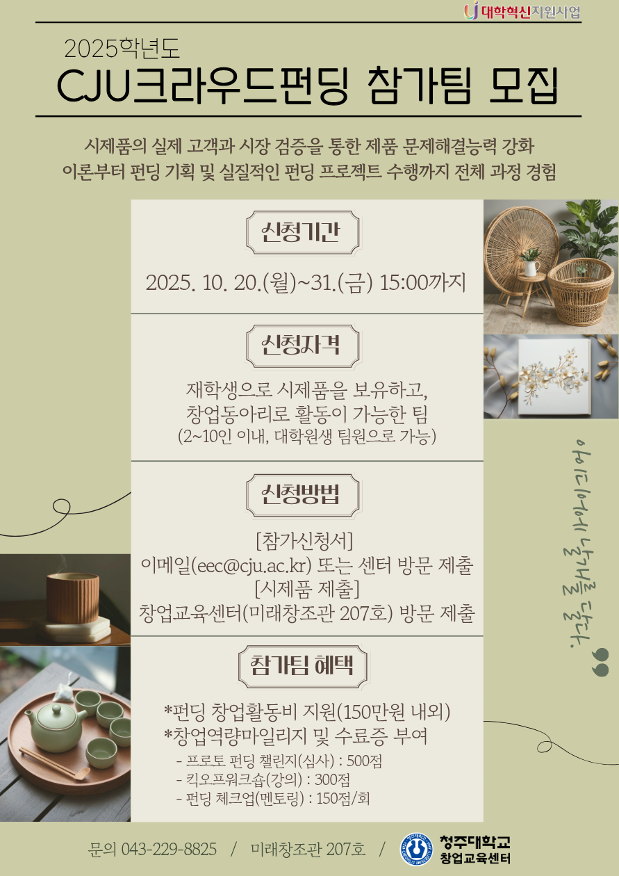 | 제목 | [모집공고] 2025학년도 CJU크라우드펀딩 참가팀 모집 |