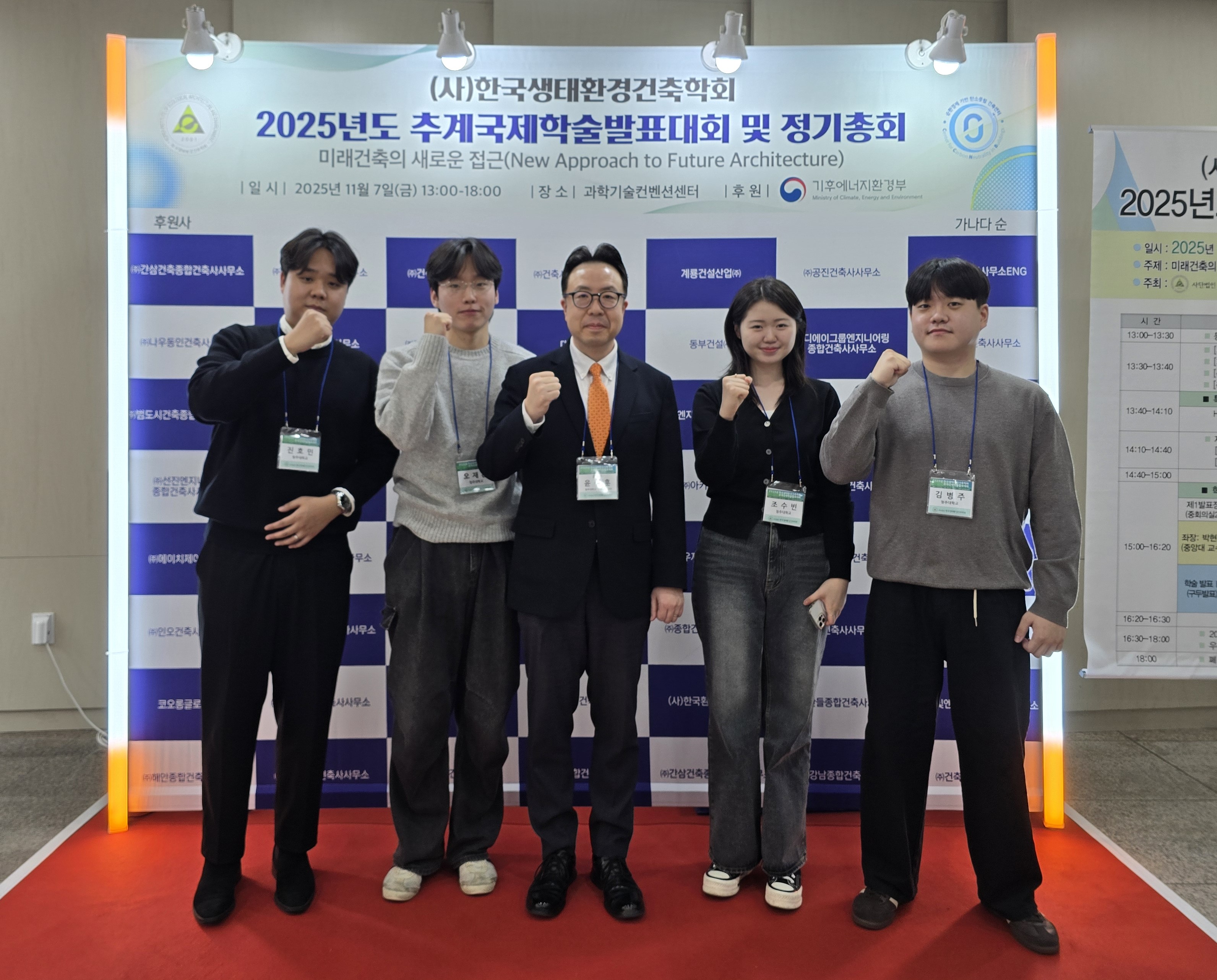 사진설명 : 최근 한국생태환경건축학회 추계국제학술대회에서 청주대 건축학과 학생들과 윤성훈(가운데)교수가 우수발표논문상을 수상한 뒤 기념사진을 촬영하고 있다. |