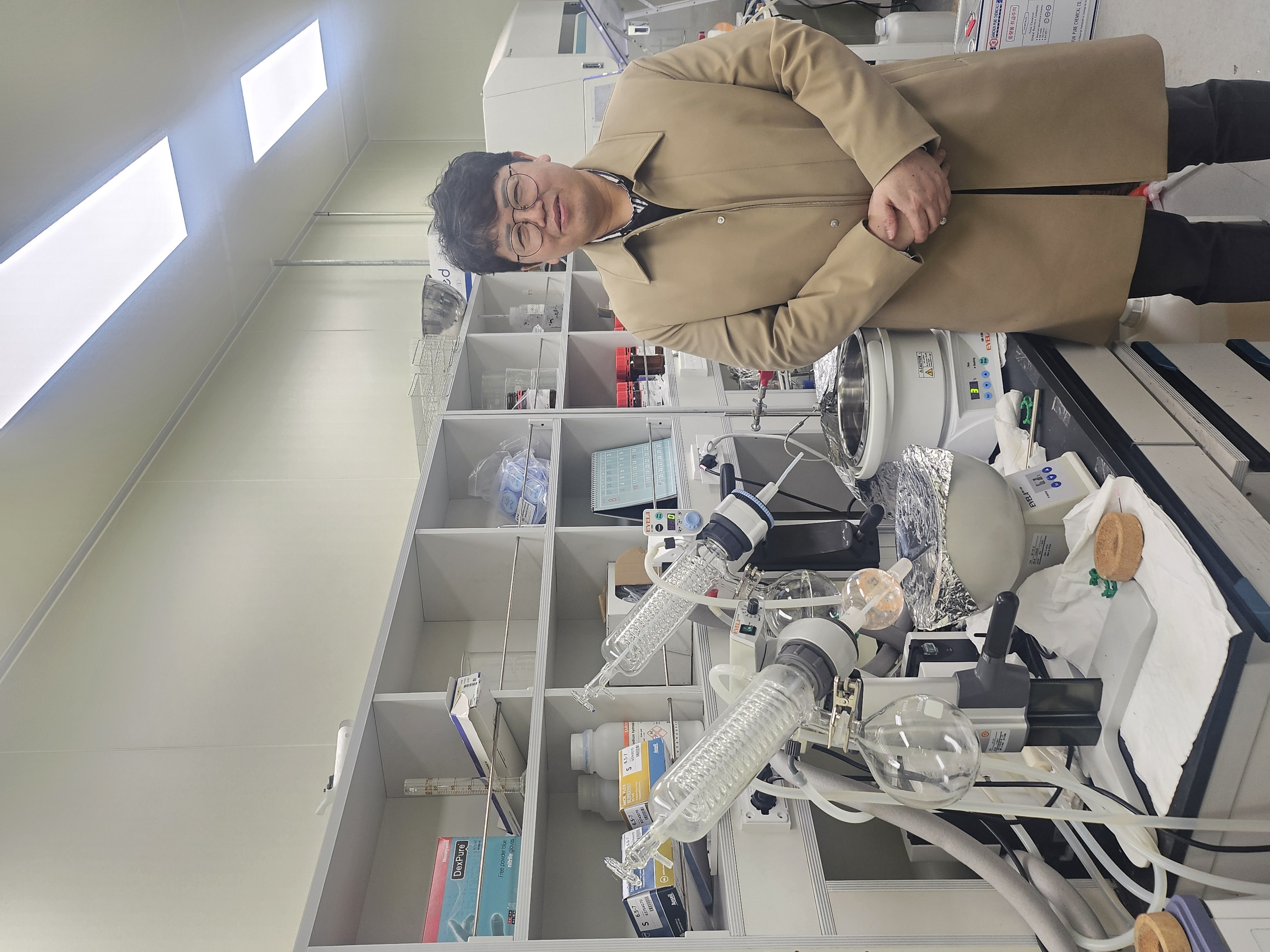 사진설명: 청주대 에너지융합공학과 김재광 교수가 고분자 합성 실험실에서 연구에 몰두하고 있는 모습.
