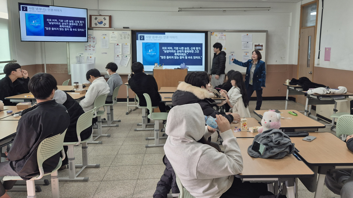 1학년은 ‘청소년의 노동인권 이해와 실천’을 주제로 노동인권 빙고 게임, 역할 바꾸기 토론, 실천 다짐문 작성 등을 통해 노동의 가치와 권리의 중요성을 배우는 시간을 가졌다.