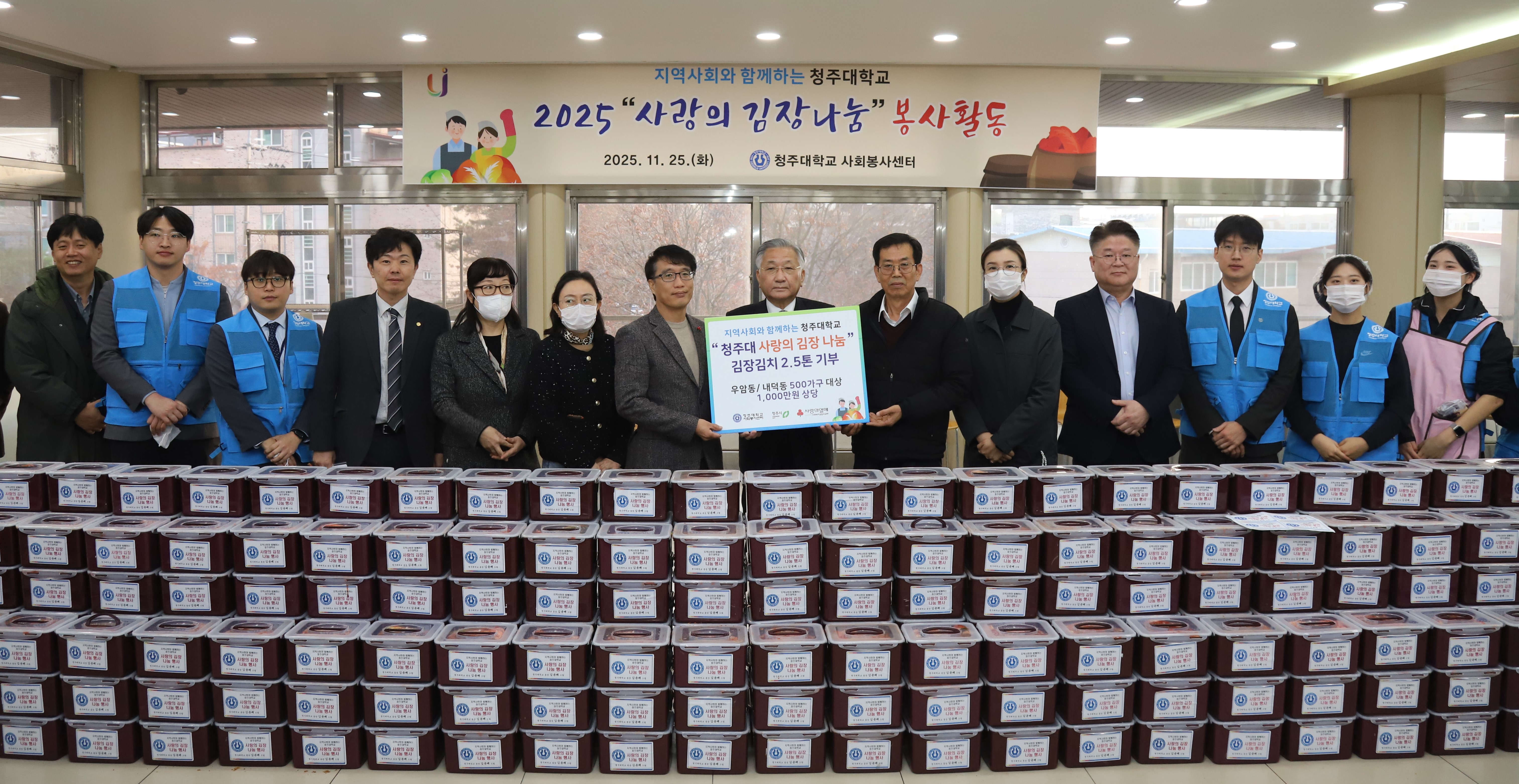 청주대 김윤배 총장을 비롯한 교직원과 유학생, 학교 인근 지역 공무원 등 150여 명은 25일 학내에서 ‘사랑의 김장 나눔 행사’를 열었다.