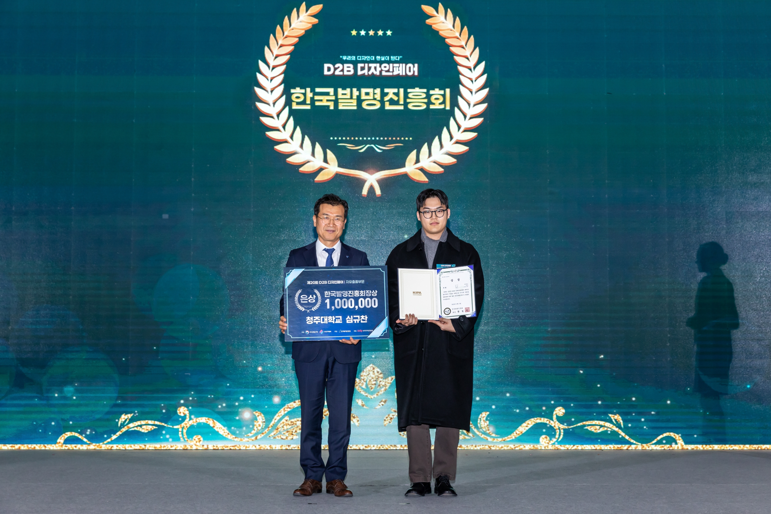 특히 이번 수상은 학생 개인의 성취를 넘어 학과의 교육 방식과 실무 중심 프로그램이 세계적 수준의 디자인 역량을 지속적으로 배출하고 있음을 보여주는 성과다. 사진설명 : 최근 열린 ‘2025 제20회 D2B 디자인페어’에서 청주대 산업디자인학과가 은상 1점, 동상 1점을 포함해 총 8점의 수상실적을 거뒀다. 사진은 수상한 뒤 기념사진을 촬영한 산업디자인학과 심규찬씨(오른쪽). |