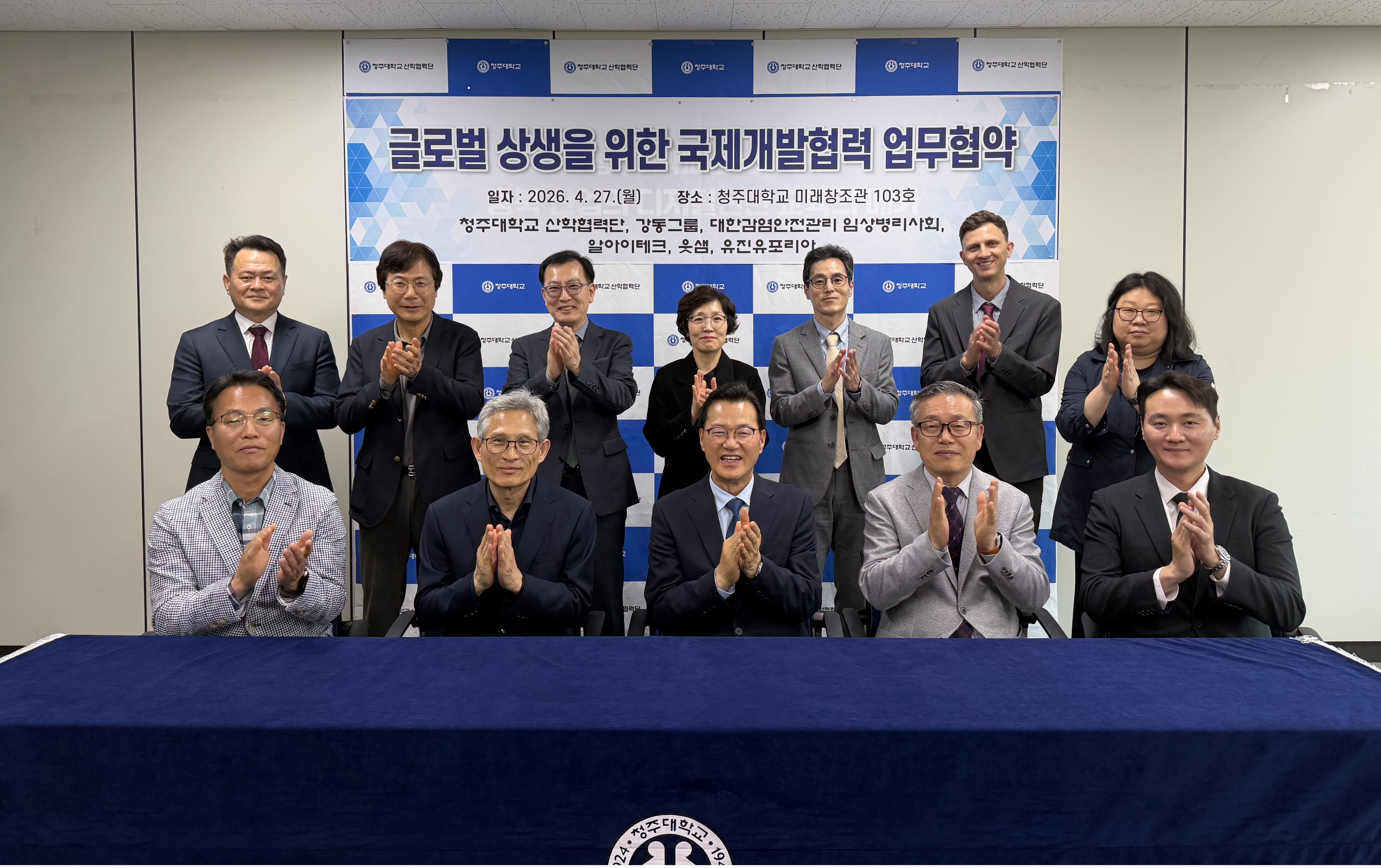 청주대학교(총장 김윤배)는 27일 ㈜강동그룹, (사)대한감염안전관리 임상병리사회, ㈜알아이테크, ㈜웃샘, ㈜유진유포리아와 글로벌 상생을 위한 국제개발협력 업무협약을 했다.