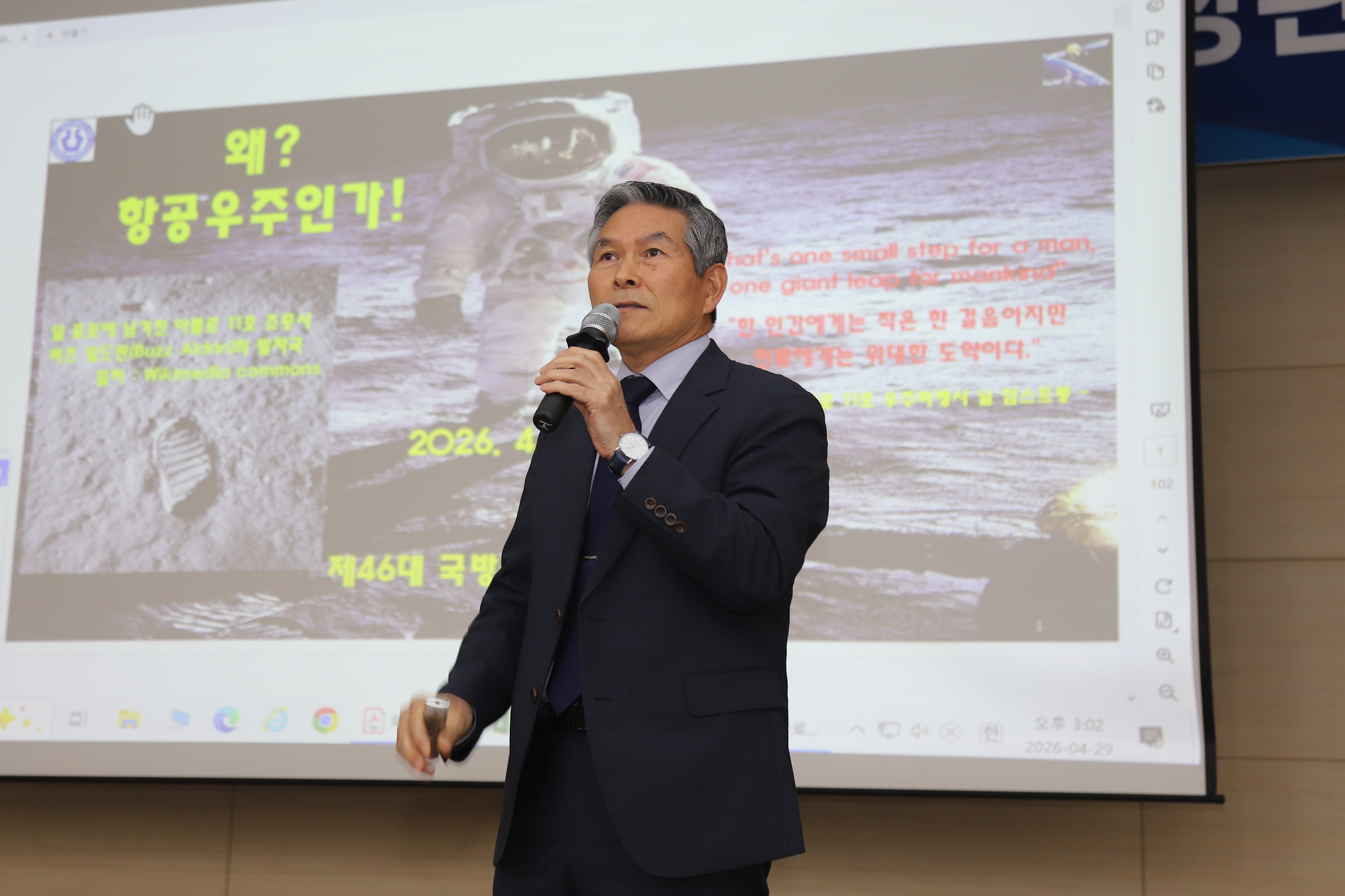 정 전 장관은 이날 강의에서 “항공 우주기술은 대기권이나 우주공간을 비행하며 항공기, 인공위성, 우주왕복선 등을 제작하고 발사하는 데 관련된 모든 기술”이라며 “우주기술은 IT, 전기, 전자, 정밀기계, 화학, 건설 등 첨단기술의 결정체”라고 설명했다.