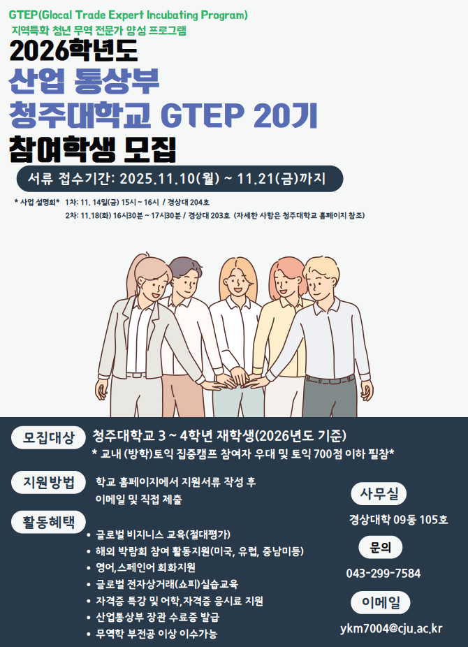 안녕하세요. 우리 대학은 산업통상부 지역특화청년무역전문가양성사업(GTEP;Glocal Trade Experts incubating Program)을 추진하고 있으며, 이에 2026학년도 제20기 청주대학교 GTEP사업에 참여할 학생들을 모집합니다.