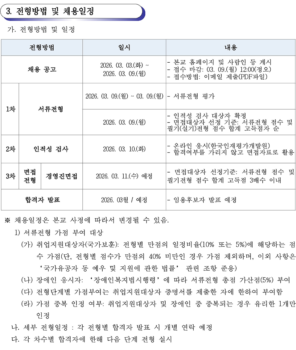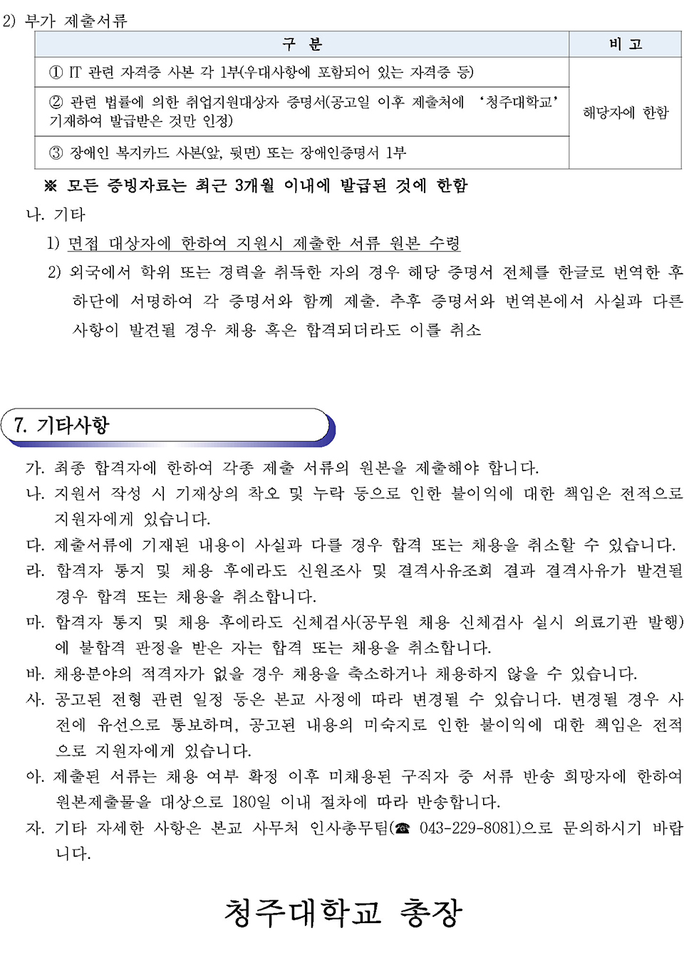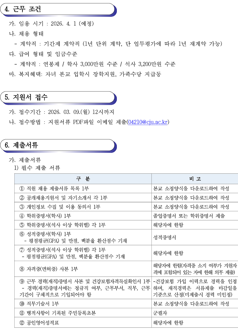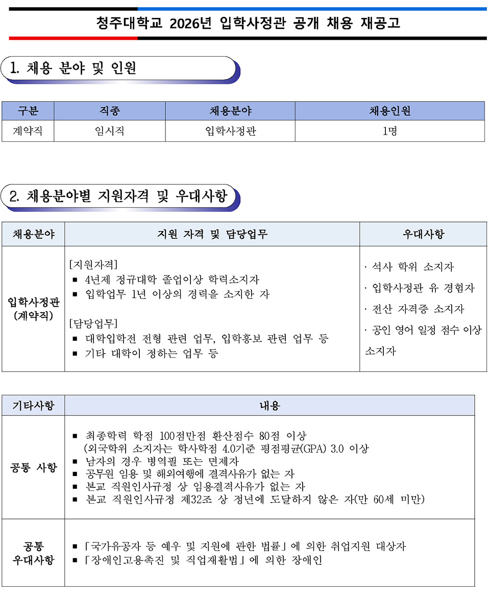 홈 소통공간 공지사항 채용공고 직원채용 공고 프린트 직원채용 공고 직원채용 공고 상세보기, 제목, 내용, 파일, 작성자등의 정보를 제공합니다. 제목 청주대학교 2026년 입학사정관 공개 채용 재공고 파일 2026년 입학사정관 공개 채용 공고(재공고).hwp 붙임2_청주대학교_입학사정관 제출서류 목록.hwp 붙임3_청주대학교_서류전형 지원 양식(입학사정관).hwp 작성자 관리자 목록 이전글 청주대학교 2026년 계약직원 공개채용 재공고 다음글 [대학일자리플러스센터] 대학일자리플러스센터 고용서비스 사업 전담 컨설턴트 채용 공고(2차)